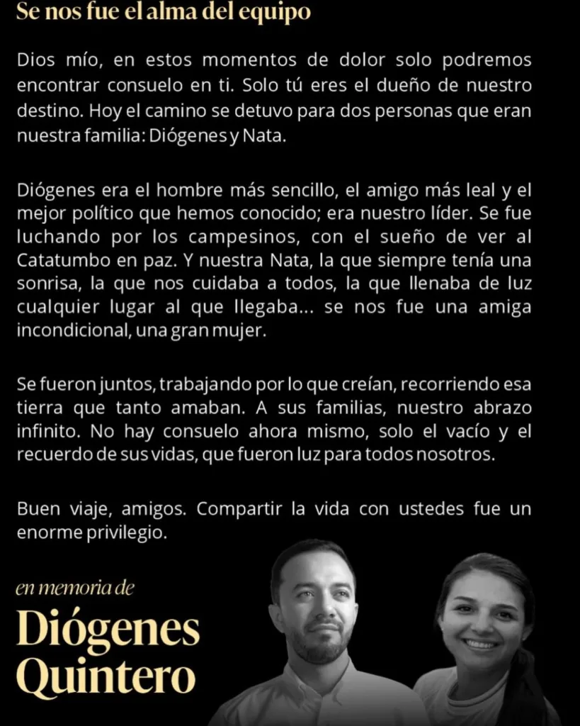 Horas más tarde, el avión fue localizado en la vereda Curasica, en una zona montañosa de difícil acceso. Las autoridades confirmaron que los 15 ocupantes fallecieron, entre ellos el congresista Quintero, quien representaba a las comunidades afectadas por el conflicto armado en el Catatumbo.