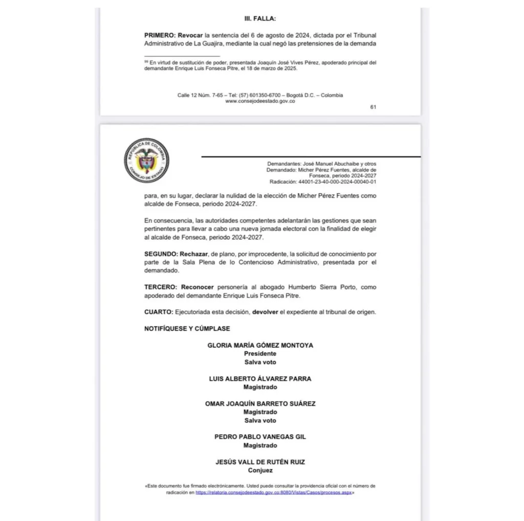 El Consejo de Estado, Sala de lo Contencioso Administrativo, Sección Quinta, profirió este 22 de enero de 2026 sentencia de segunda instancia dentro del medio de control de nulidad electoral radicado 44001-23-40-000-2024-00040-01, mediante la cual revocó la decisión del Tribunal Administrativo de La Guajira y, en su lugar, declaró la nulidad de la elección de Micher Pérez Fuentes como alcalde de Fonseca para el periodo 2024–2027.
