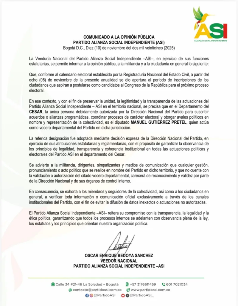 El Partido Alianza Social Independiente (ASI) hizo público un comunicado de prensa en el que aclara a la opinión pública, a su militancia y a los actores políticos del Cesar que el único autorizado para suscribir alianzas programáticas, coordinar procesos electorales y otorgar avales políticos en el departamento es el diputado Manuel Gutiérrez Pretel, quien actúa como vocero departamental de la colectividad.