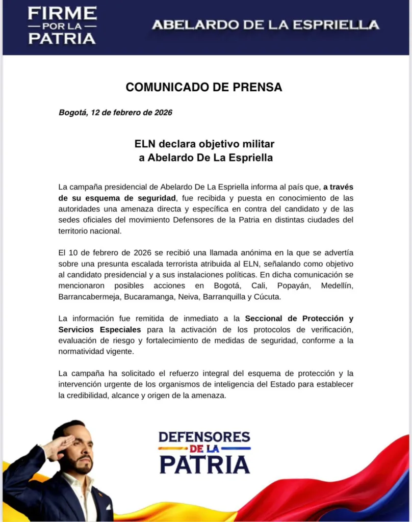 La campaña presidencial del abogado y aspirante a la Presidencia Abelardo De La Espriella denunció este jueves 12 de febrero de 2026 la recepción de presuntas amenazas en su contra, supuestamente atribuidas al Ejército de Liberación Nacional (ELN).