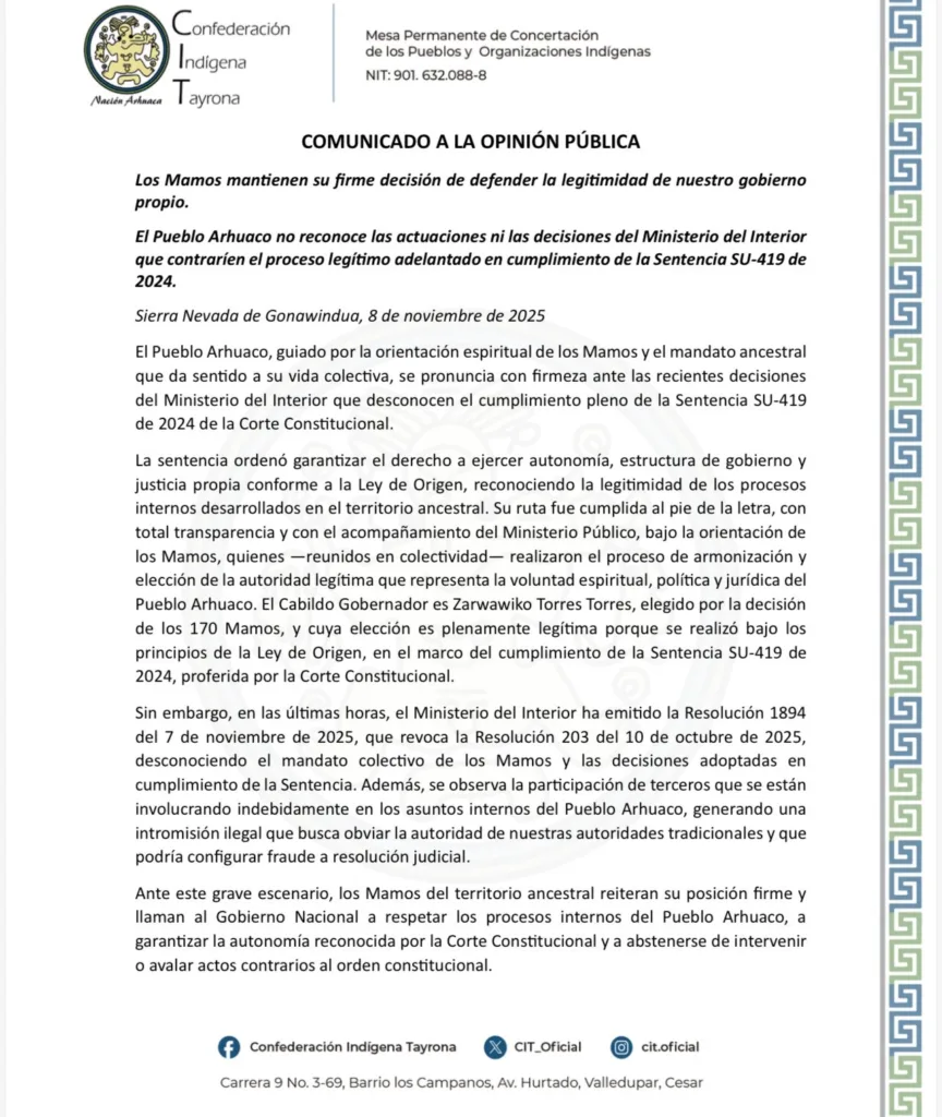 El Pueblo Arhuaco, orientado por la guía espiritual de los Mamos, se pronunció en defensa de su autonomía y legitimidad frente a las recientes decisiones del Ministerio del Interior, que —según denuncian— desconocen lo ordenado por la Corte Constitucional en la Sentencia SU-419 de 2024.