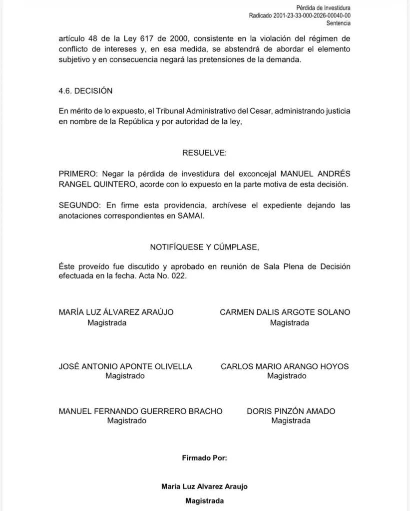 El Tribunal Administrativo del Cesar falló a favor de Manuel Andrés Rangel Quintero dentro del proceso de pérdida de investidura que se adelantaba por actuaciones durante su período como concejal de Aguachica (2020-2023).
